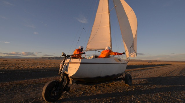 Before we could start, however, the trailer had to be reconverted into the LAND SAILOR – an undertaking which took us almost a whole day. Tension rose: Even though we had had some test runs in Germany, it stayed unclear until then, if the whole idea would finally work out in the conditions we found in Patagonia. Being perfectly well-prepared, you can still be surprised by the real conditions. As there was no similar project whatsoever, we couldn’t rely on any experience, either. The whole project was therefore an artist’s experiment whose early failure was possible, and thus, we were all quite nervous. At the same time, we shared our common confidence in the project, which had brought us all there to tackle the advantage.